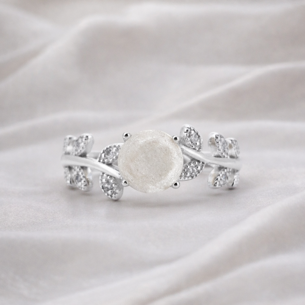 At its heart sits a smooth, round breastmilk stone, gently cradled between two delicate leaf-shaped shoulders. Each leaf is set with fine accent stones that catch the light beautifully, creating a graceful frame that draws the eye toward your most precious inclusion.