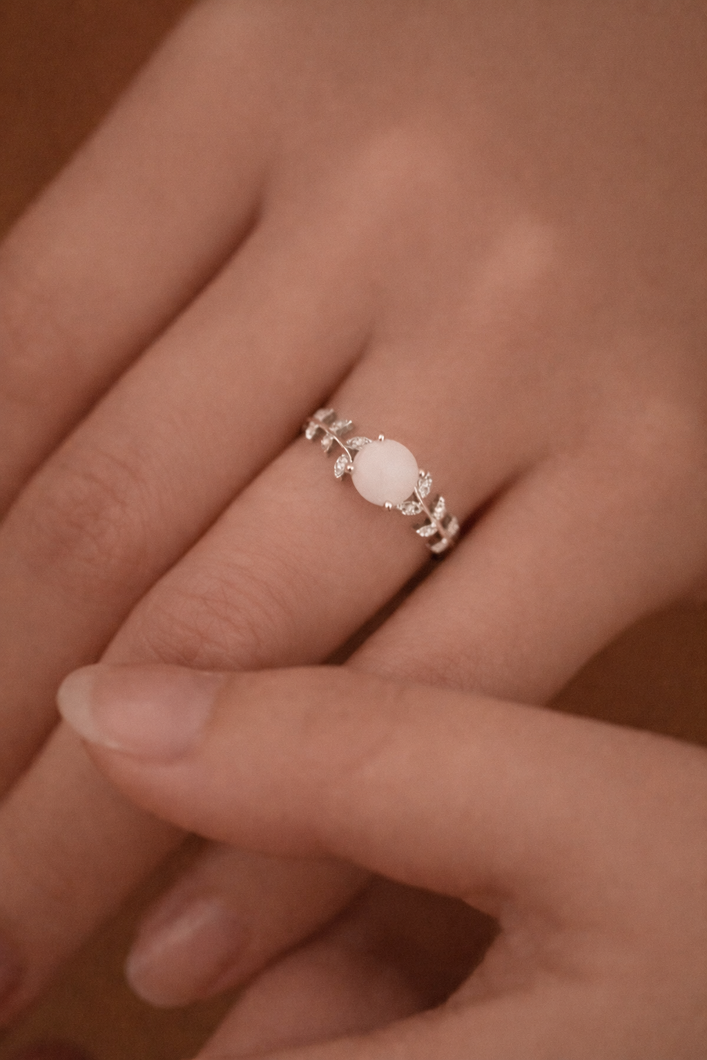 Central round inclusion stone framed by leaf-motif shoulders with sparkling accents