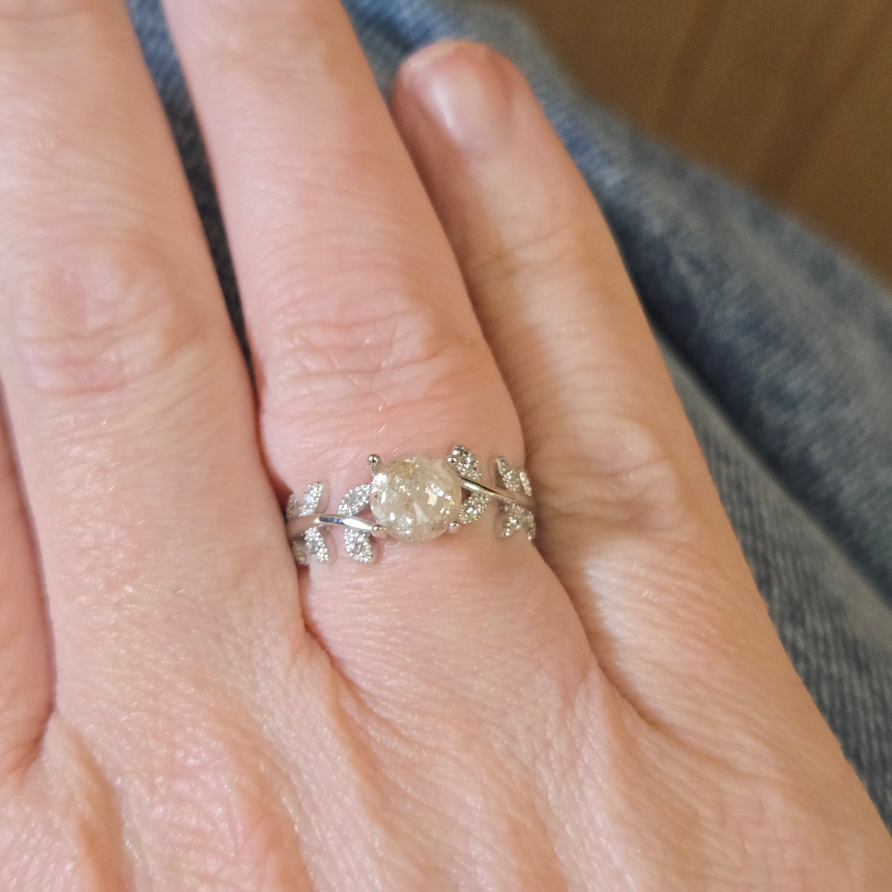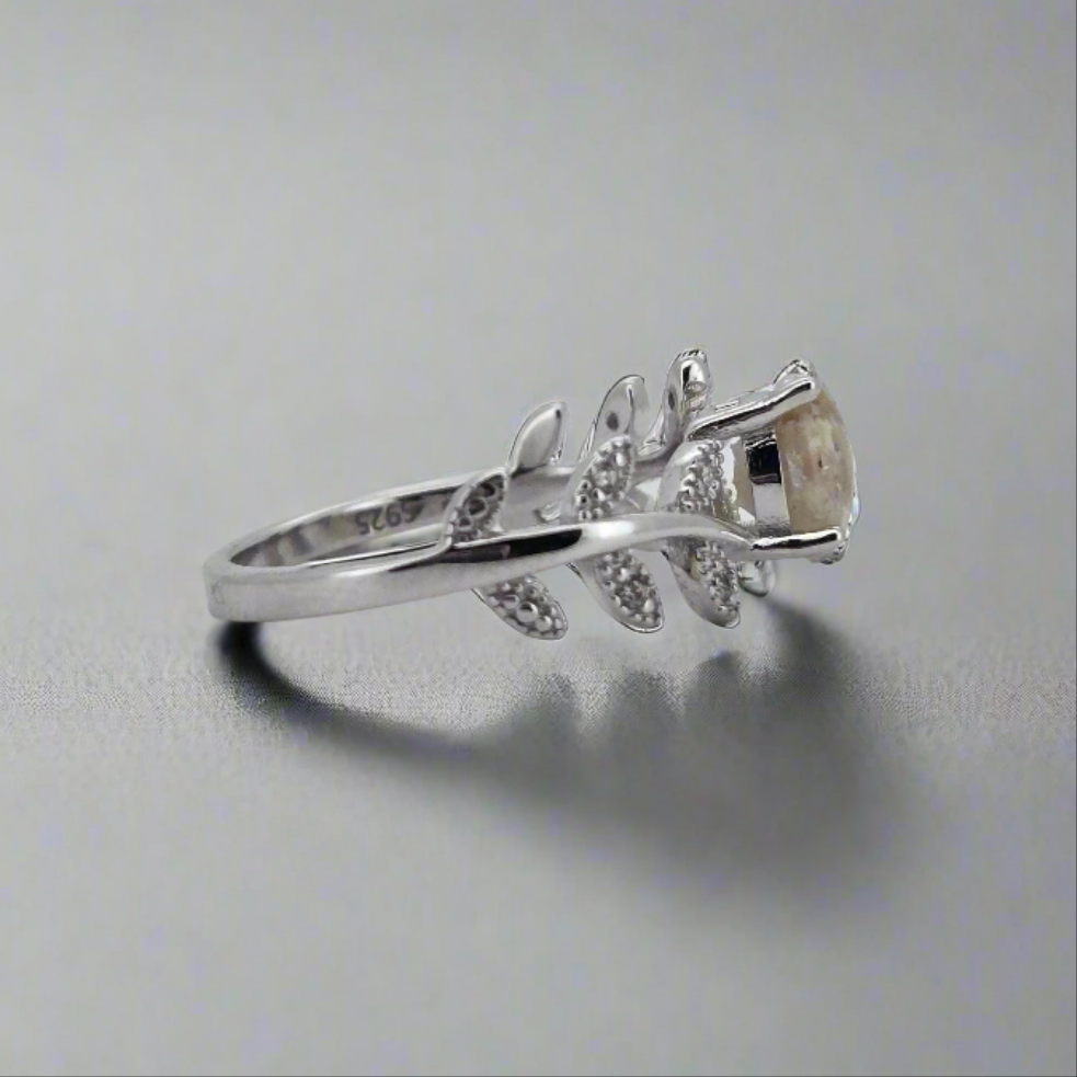 The Esme is a graceful design inspired by nature, symbolising love, memory, and connection. Featuring a round inclusion stone framed by delicate leaf-shaped shoulders set with sparkling accents, this ring is a timeless tribute to those you hold close.